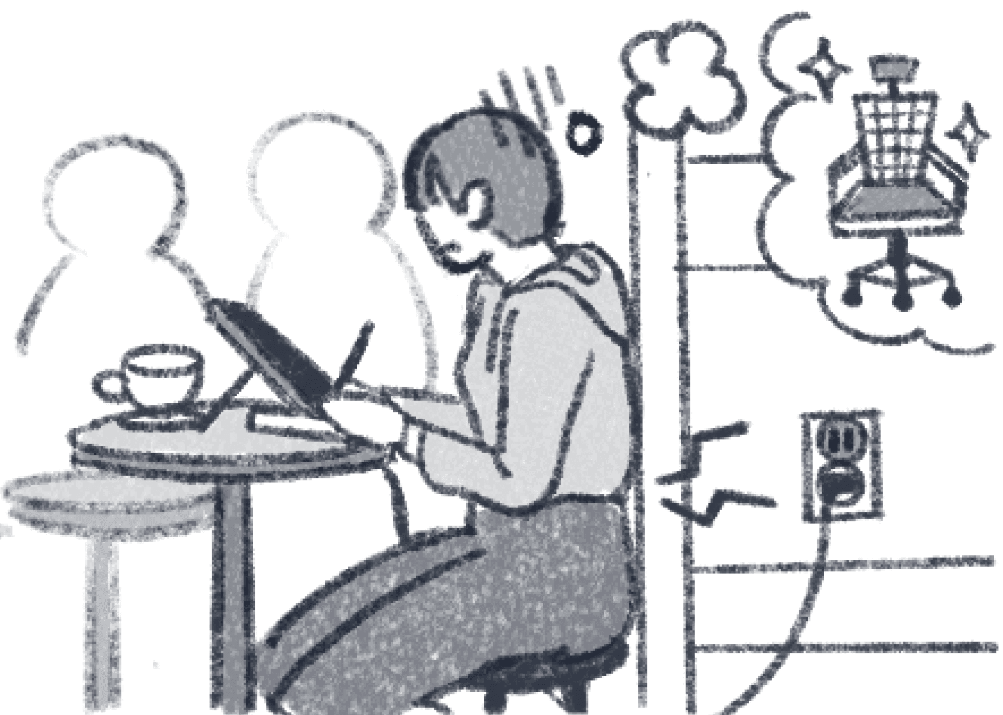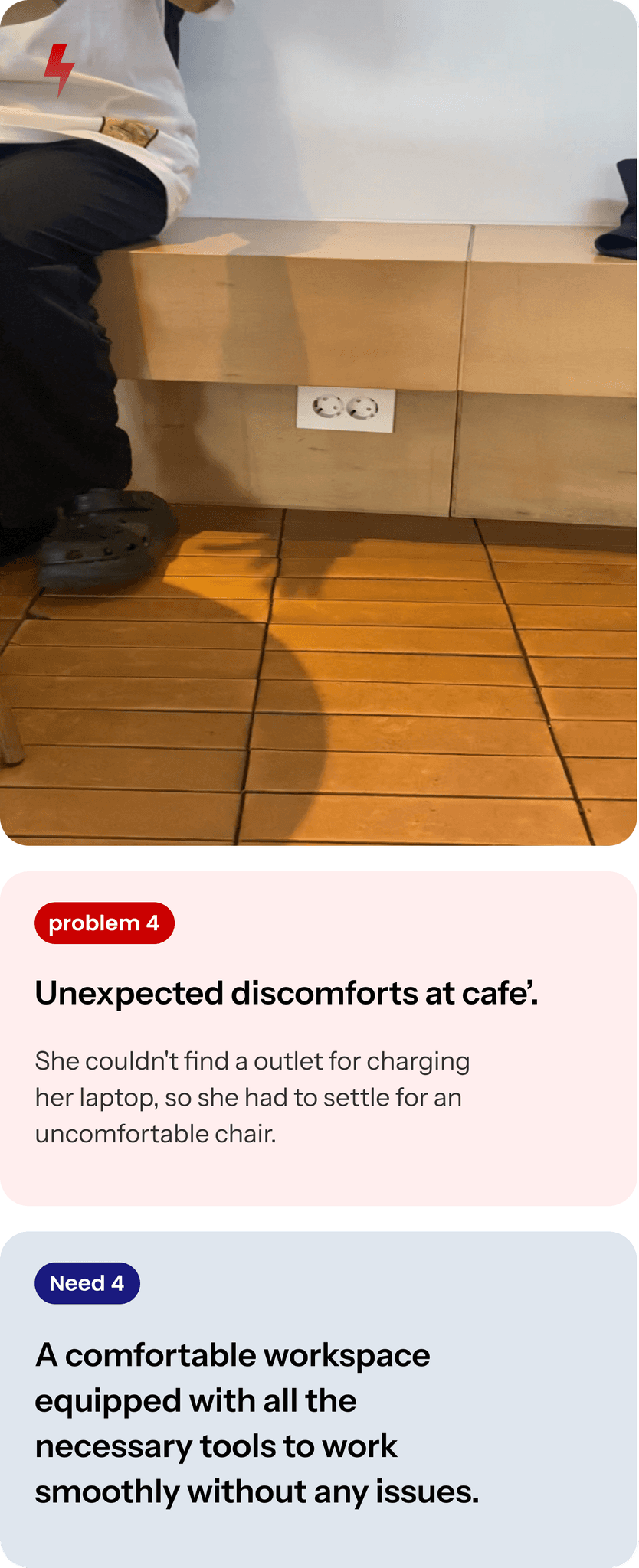 Not having a charging spot, I sometimes had to find another cafe or settle for an uncomfortable chair.”