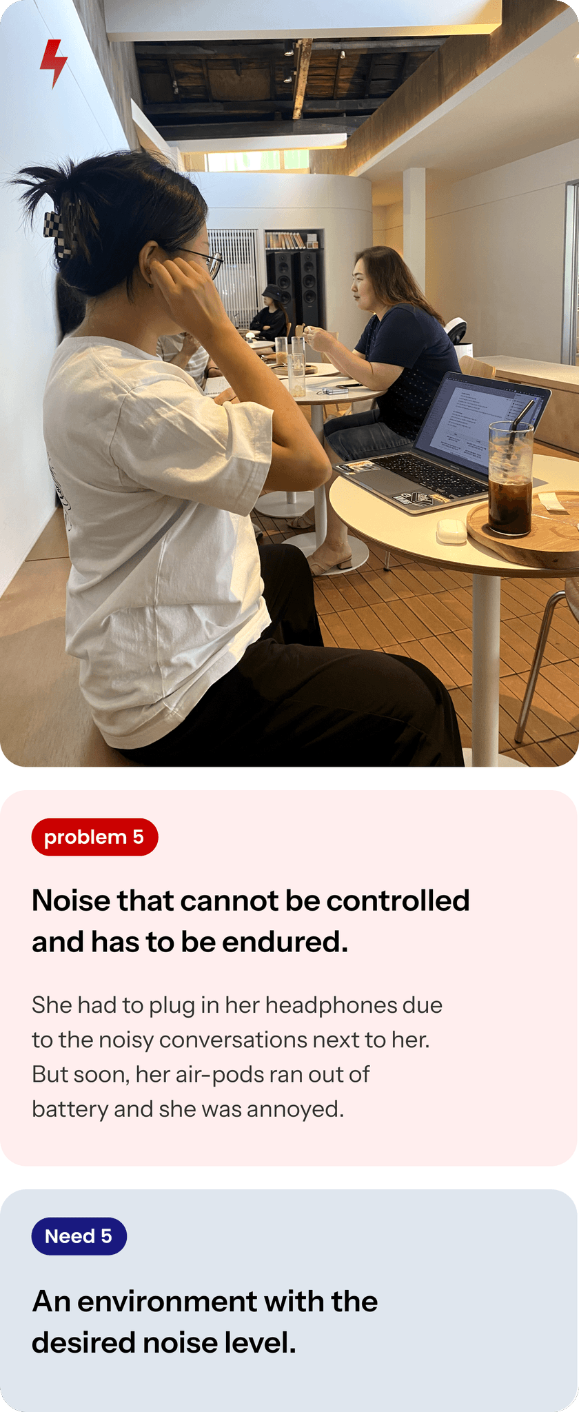 She had to plug in her headphones due to the noisy conversations next to her. But soon, her air-pods ran out of battery and she was annoyed.