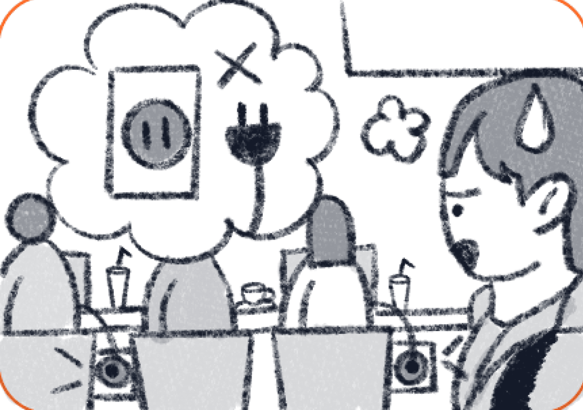 Sebin, upon arriving at the cafe, realizes that all the seats with power outlet for her iPad are taken.