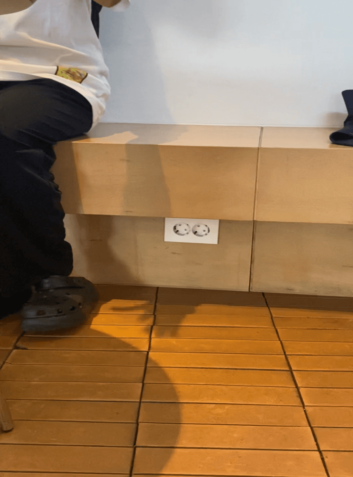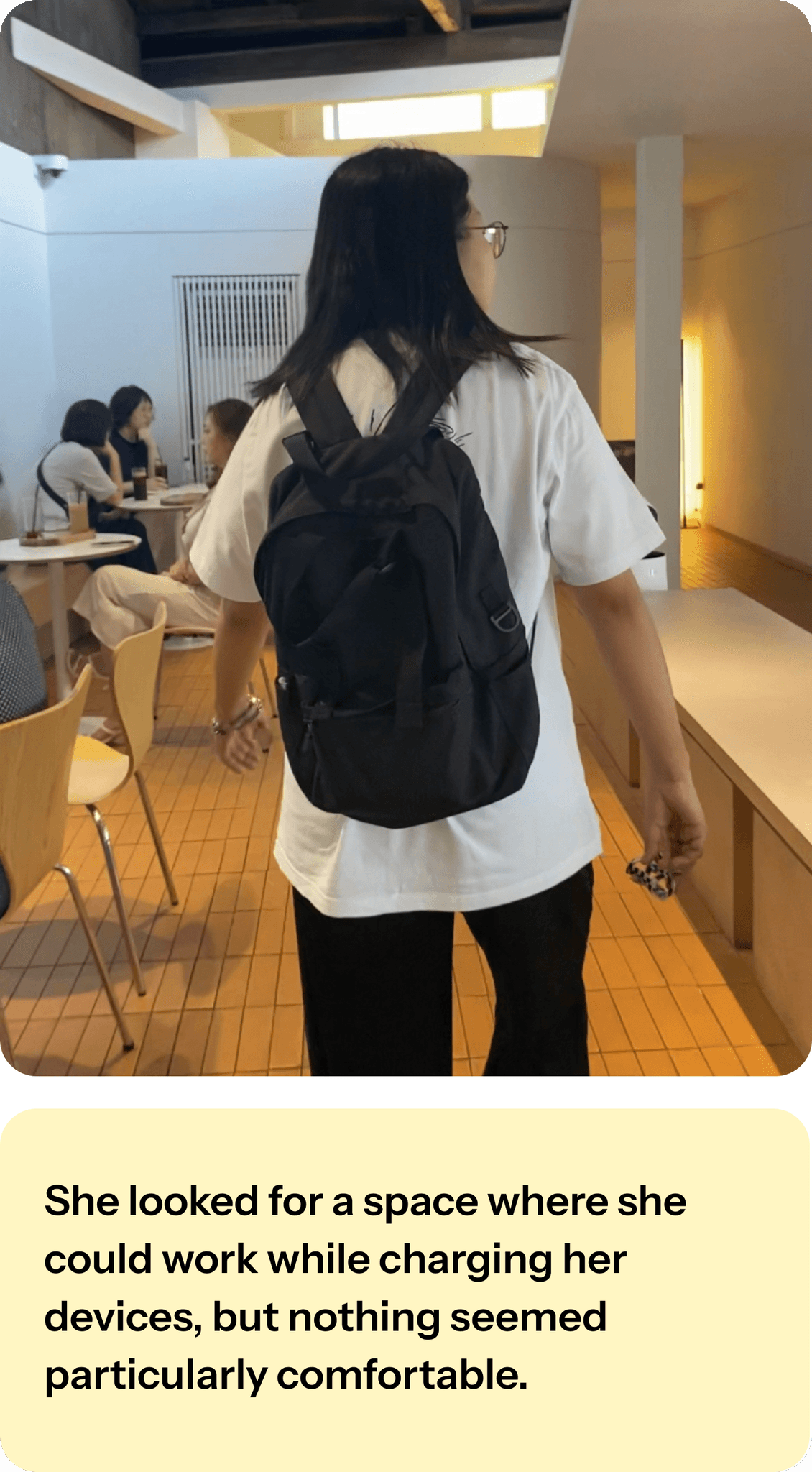 She looked for a space where she could work while charging her devices, but nothing seemed particularly comfortable.