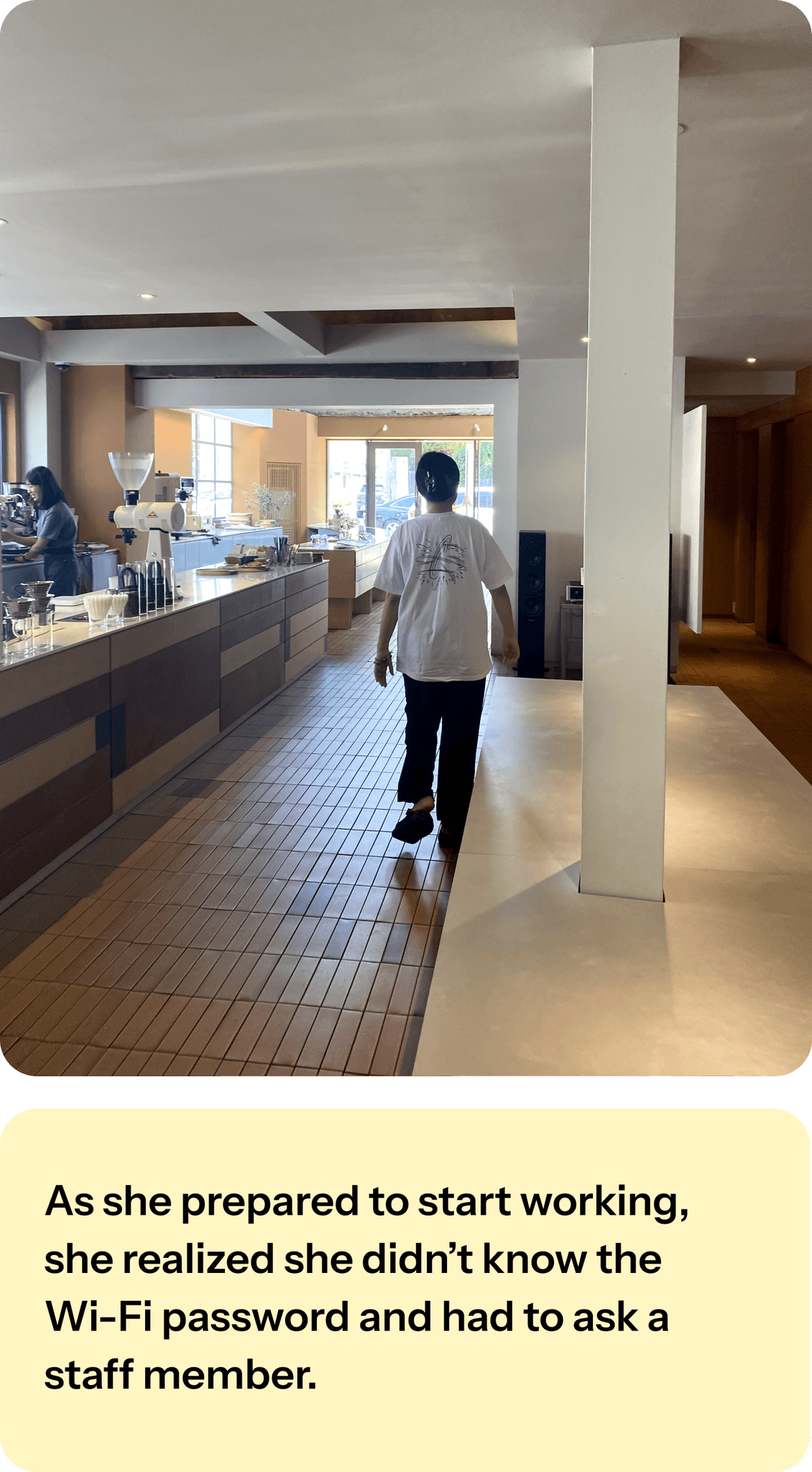 As she prepared to start working, she realized she didn’t know the Wi-Fi password and had to ask a staff member.