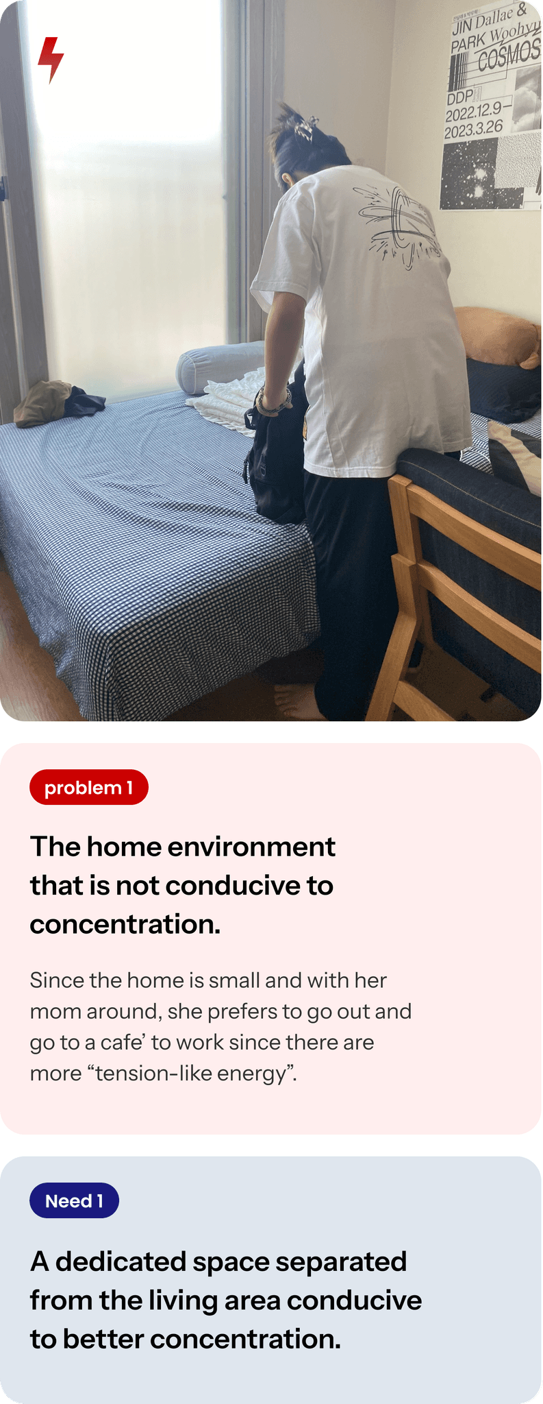 Since the home is small and with her mom around, she prefers to go out and go to a cafe’ to work since there are more “tension-like energy”.